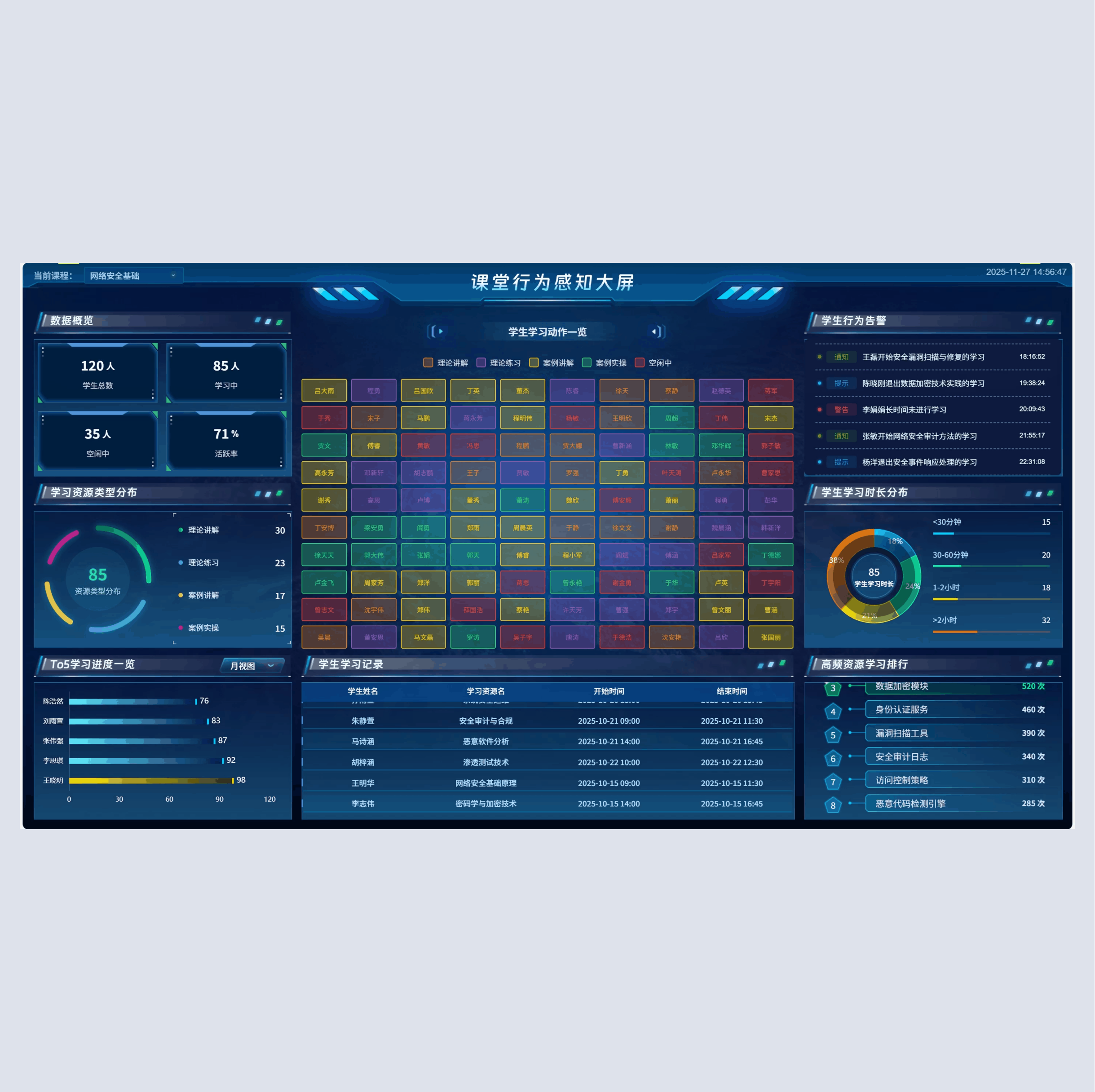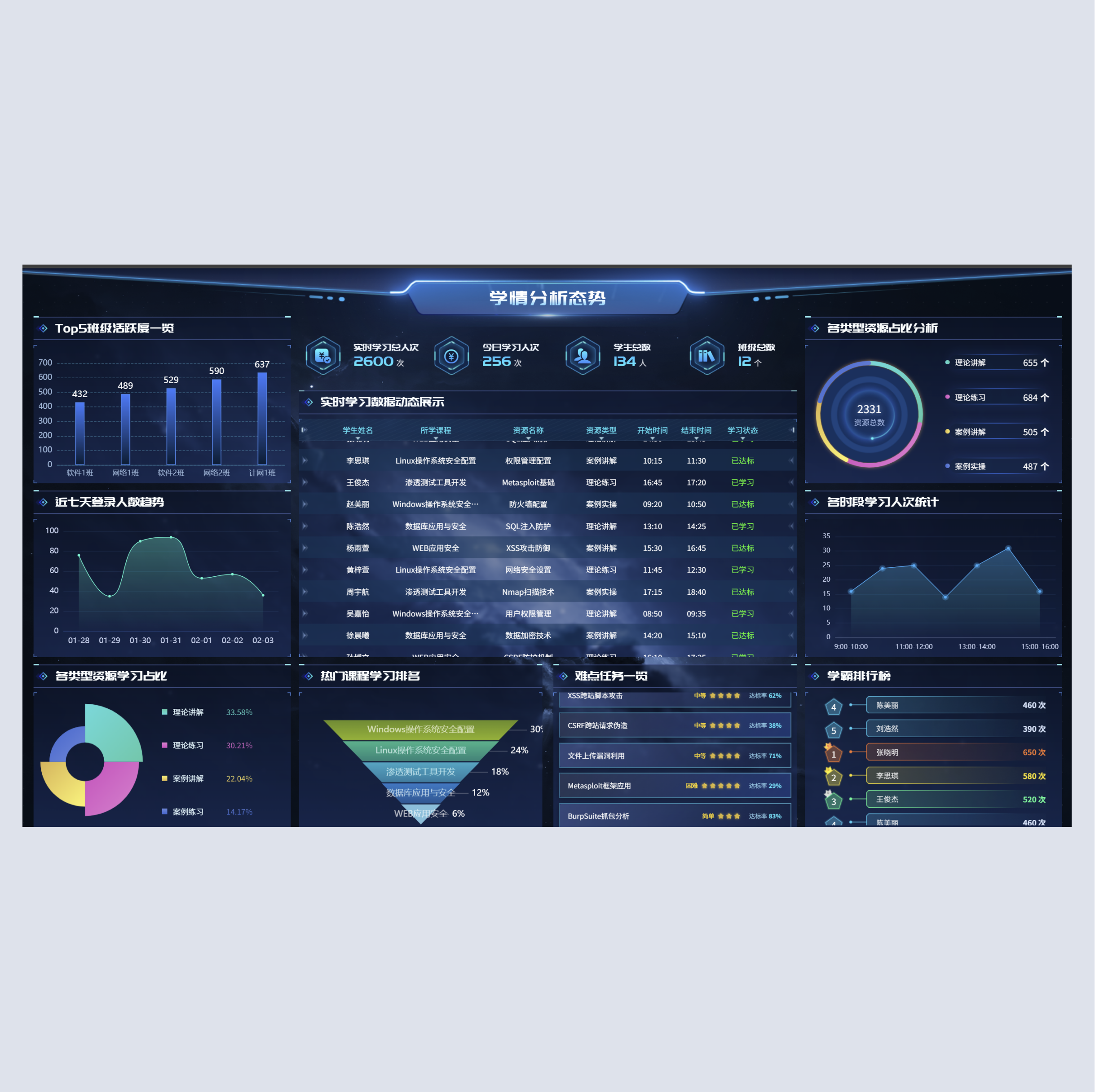 教师可顺利获得驾驶舱实时监控教学成效,快速定位教学难点与学生共性薄弱环节,从而及时调整教学策略,召开针对性的集体辅导或个性化干预。教学管理者可顺利获得驾驶舱纵览专业建设全景,分析各课程的教学进度、资源使用情况、学生学习效果等,为教学优化与资源调配给予科学的数据依据。